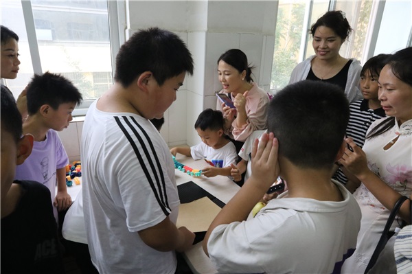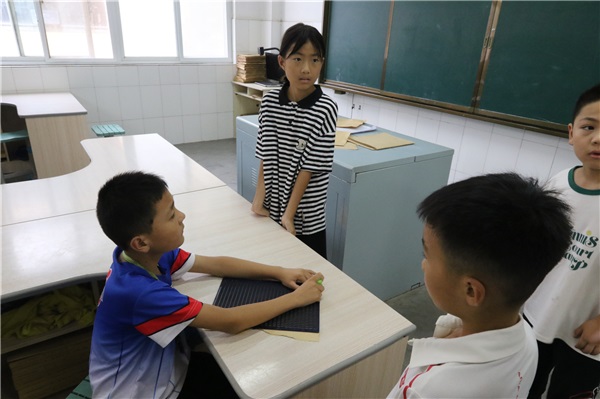在校園中,孩子們一起相互交流。學(xué)校的學(xué)生們給新朋友介紹自己的學(xué)習(xí)生活,帶他們學(xué)習(xí)感受簡(jiǎn)單的手語(yǔ)、扎寫盲文等,堅(jiān)強(qiáng)的殘疾學(xué)生們讓初次來(lái)到這里的孩子和家長(zhǎng)們深受觸動(dòng)。