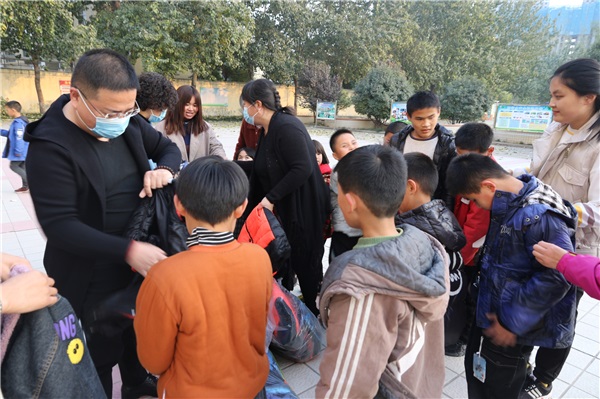 在按照防疫要求進行測溫等流程后,愛心人士帶著捐贈品進入校園。捐贈現(xiàn)場,他們?yōu)閷W校的低年級學生挑選合適的衣服,并親手為孩子們穿上,關(guān)心地詢問著學生們的生活情況,學生們也不時地對他們說著“謝謝”,隨后愛心人士與學生們進行了合影留念。
