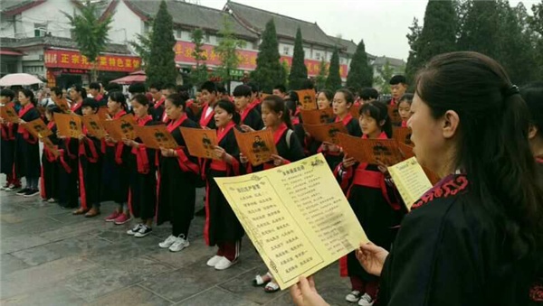 上午10點,參加研學(xué)的50余名師生,步入萬仞宮墻。在參觀中,師生們手拉著手相互幫扶著,手語老師認(rèn)真的向?qū)W生們介紹儒學(xué)文化思想,學(xué)生們認(rèn)真聆聽,仔細觀看介紹,用心感受中華文化的博大精深。并在萬仞宮墻前身穿漢服參加拜師禮。此外,一行人認(rèn)真聆聽了儒學(xué)講師講述孔子跌宕起伏的一生,見證圣賢成長之路,并現(xiàn)場誦讀國學(xué)經(jīng)典《論語》。