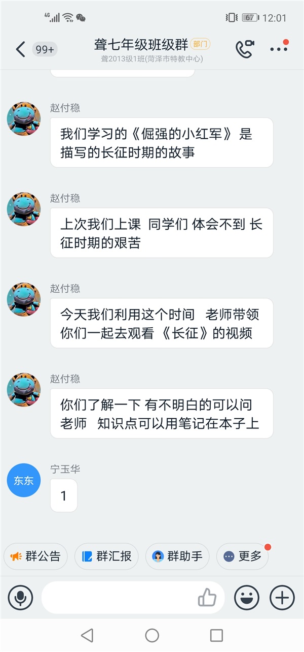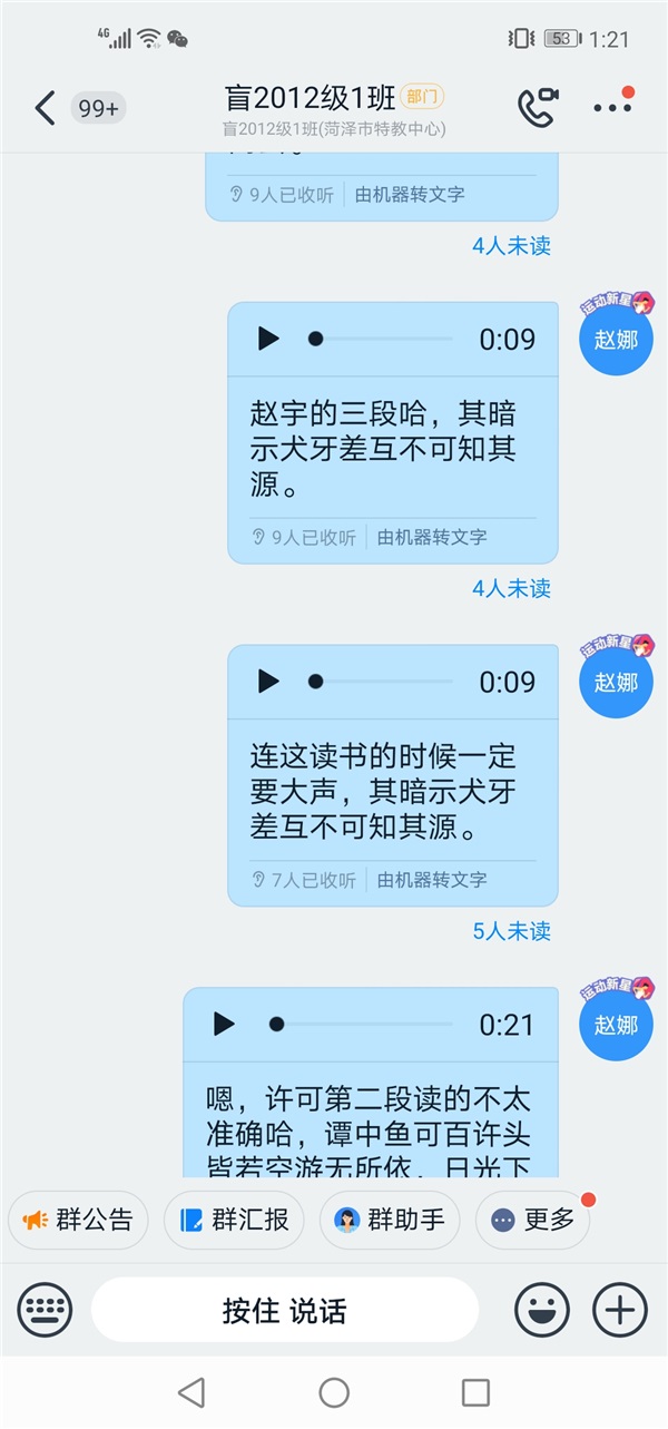 啟明部教師通過釘釘語音指導盲生有感情朗讀課文。