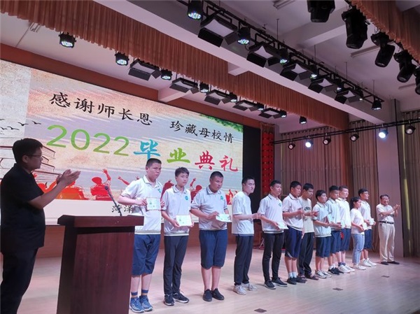 典禮在雄壯的國(guó)歌聲中拉開了序幕。首先,毛校長(zhǎng)在熱烈的掌聲中致辭。他回顧了學(xué)校近幾年快速發(fā)展的歷程,對(duì)圓滿完成學(xué)業(yè)的69名畢業(yè)生表示熱烈的祝賀,并肯定了同學(xué)們的成長(zhǎng)與進(jìn)步,希望他們自尊、自信、自立、自強(qiáng),注重提高自己的專業(yè)技能,利用一技之長(zhǎng)在社會(huì)立足;同時(shí)繼續(xù)保持向上的心理,常懷一顆感恩之心,永遠(yuǎn)珍藏在母校期間這段難忘的歲月,牢記學(xué)校、老師的殷切希望,慎重選擇自己的目標(biāo),拼出精彩的人生。緊接著家長(zhǎng)代表、畢業(yè)生代表以及教師代表依次進(jìn)行發(fā)言。期間,盲九年級(jí)畢業(yè)生代表為學(xué)校敬獻(xiàn)錦旗,表達(dá)對(duì)母校的感謝之情,毛校長(zhǎng)在熱烈的掌聲中代表學(xué)校接受錦旗。隨后,王校長(zhǎng)宣讀了2022年畢業(yè)生名單,毛校長(zhǎng)為學(xué)生們頒發(fā)了畢業(yè)證書,并對(duì)九年級(jí)學(xué)生頒發(fā)了職業(yè)中專錄取通知書。一本本證書,滿載著學(xué)子們寒窗數(shù)載的辛苦,飽含著教師們?nèi)绺溉缒傅母冻觥?br />