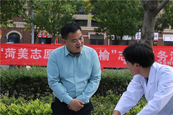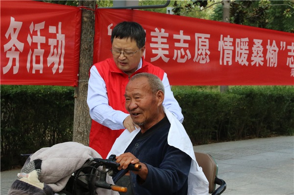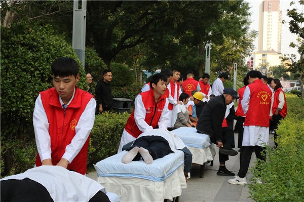 參加活動的師生來到趙水洼社區(qū)附近,在現(xiàn)場為社區(qū)的老人們進(jìn)行一系列的志愿服務(wù)。學(xué)校盲中職部的同學(xué)們用自己所學(xué)的按摩方法為老人們進(jìn)行推拿按摩。“您平常哪里不舒服?我給您按按”“力度可以嗎?”同學(xué)們雙手搭在老人的肩膀上,耐心地詢問著。在按摩過程中,他們還不斷地告訴爺爺奶奶們平時減輕身體不適的方法,提醒老人們多注意身體健康。