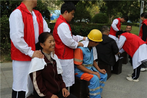 黃保民老師則為了照顧不方便的下車的老人,特意走到三輪車前為老人按摩肩膀。“哎呀,這一按真得勁兒,松快多了”剛剛結(jié)束按摩的一位奶奶對同學(xué)們的按摩手法表示贊揚(yáng)。