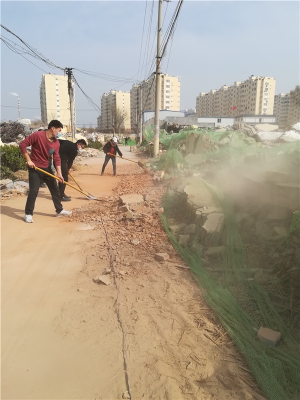 2018年3月26日,菏澤市特教中心“花都特教志愿服務隊”盲數(shù)學組不畏炎熱,來到趙水洼社區(qū)拆遷后廢墟里的小路,清理碎石、瓦礫、垃圾。