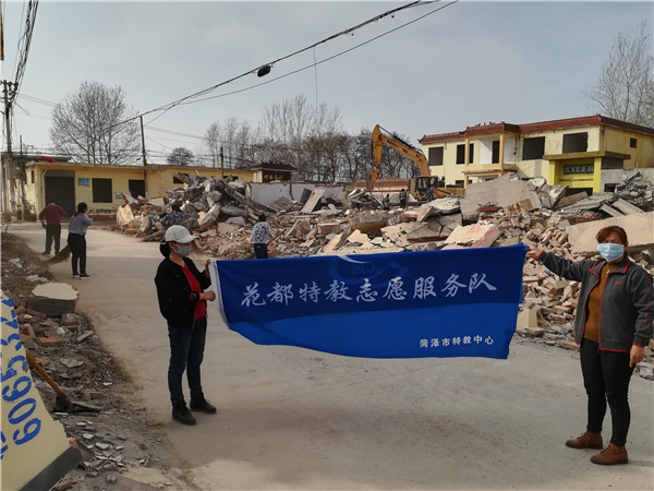 菏澤市特教中心“花都特教志愿服務隊”清掃廢墟中的小路