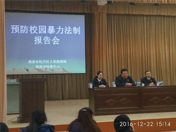 12月22日下午,菏澤市牡丹區(qū)人民檢察院黨組成員、檢察委員會專職委員、全國青少年優(yōu)秀輔導(dǎo)員尹慶慧為我校師生做了一場精彩的“預(yù)防校園暴力”法制報(bào)告會。
