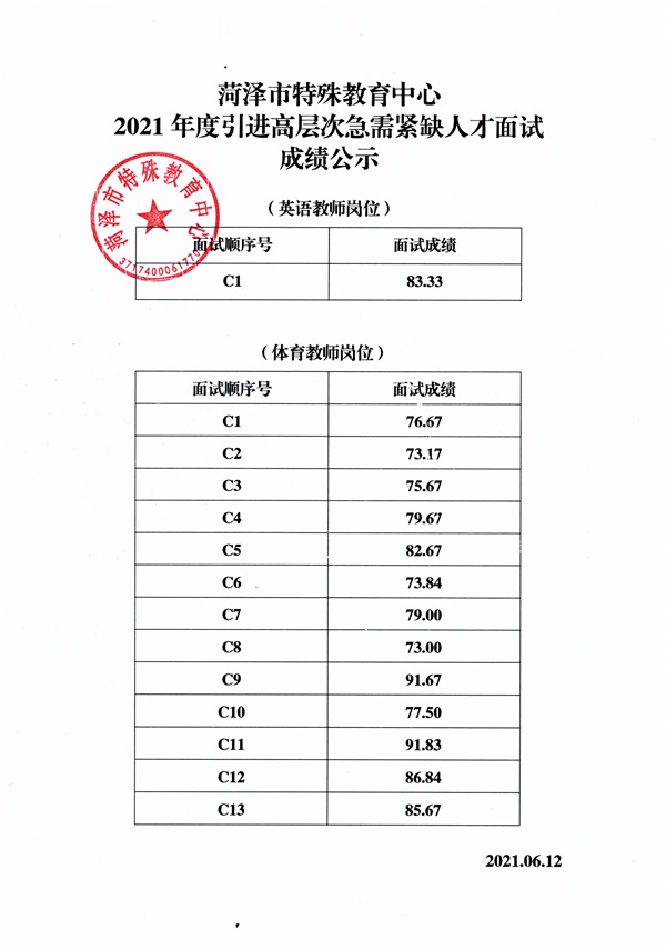 菏澤市特殊教育中心2021年度引進(jìn)高層次急需緊缺人才面試成績公示