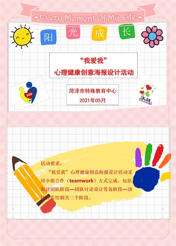 為貫徹落實菏澤市教育局關(guān)于舉辦2021年菏澤市學(xué)校心理健康教育月活動的通知,切實推動我校心理健康教育月特色活動的開展,積極營造“健康心態(tài) 陽光成長”的心理健康教育氛圍,本屆心理健康活動月大膽創(chuàng)新活動內(nèi)容與方式,重點培養(yǎng)特殊學(xué)生積極陽光的心態(tài)與團(tuán)隊合作精神,2021年5月25日我校成功開展首屆“我愛我”心理健康創(chuàng)意海報設(shè)計活動,本項活動從設(shè)計任務(wù)的啟動到小組設(shè)計作品的上交歷時7天。