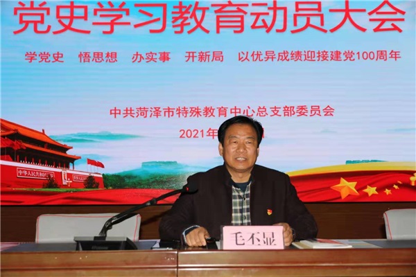 為貫徹落實中央、省委、市委和全省教育系統(tǒng)關(guān)于黨史學(xué)習(xí)教育的部署和有關(guān)要求,扎實做好學(xué)校黨史學(xué)習(xí)教育,2021年3月25日,菏澤市特殊教育中心在多功能廳召開黨史學(xué)習(xí)教育動員大會,對學(xué)校開展黨史學(xué)習(xí)教育進行動員部署。校黨總支書記、校長毛丕顯同志出席會議并作動員講話。黨總支委員、全體黨員教師參加會議,會議由黨總支副書記、副校長張士良同志主持。