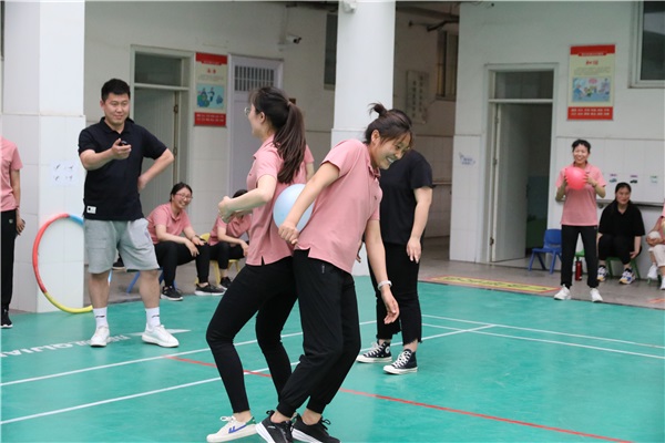 隨后比賽正式開始,教師們各個(gè)摩拳擦掌,蓄勢(shì)待發(fā)。呼啦圈過人體比賽中,教師們手拉手圍成圈,在相互手不放開的前提下,讓呼啦圈穿過所有人。大家配合默契,呼啦圈隨著手部上下的節(jié)奏和身體的配合快速地穿過每一個(gè)。在大手拉小手比賽中,大家根據(jù)自己的位置快速調(diào)整步伐,在快與慢之間找到平衡,從兩個(gè)人到所有組員,彼此之間緊緊牽著手向前奔跑。記憶接力、橫行霸道、趣味保齡球比賽同樣是精彩紛呈,扣人心弦,整個(gè)比賽場(chǎng)上充滿了加油聲和歡笑聲。