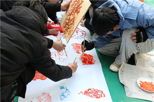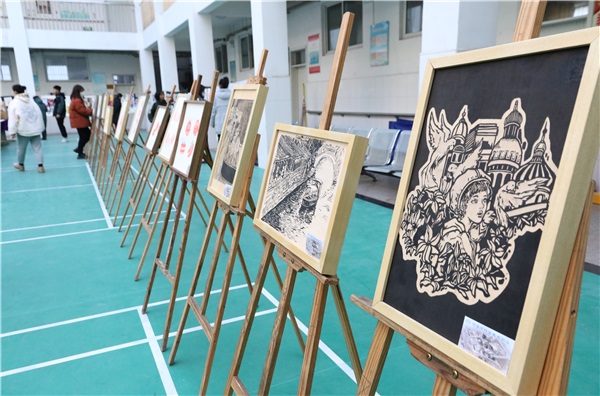 本次校園藝術(shù)節(jié)展出了泥塑、木雕、版畫(huà)、國(guó)畫(huà)、刻瓷等多種藝術(shù)形式作品,作品內(nèi)容也是豐富多彩。刻得精雕細(xì)琢,畫(huà)得栩栩如生,構(gòu)思巧妙,造型各異,每一件作品都充滿(mǎn)著學(xué)生豐富的創(chuàng)造力和想象力?;顒?dòng)還有精彩的現(xiàn)場(chǎng)創(chuàng)作部分,一條三十余米的長(zhǎng)卷橫鋪在展覽區(qū)前方,聾部低年級(jí)到職業(yè)班的學(xué)生專(zhuān)注地在上面進(jìn)行創(chuàng)作,揮灑藝術(shù),前來(lái)參觀的師生不時(shí)地對(duì)他們豎起大拇指。純白的畫(huà)布在同學(xué)們的巧手下,變得五彩繽紛。雖無(wú)法用言語(yǔ)傳遞感情,但同學(xué)們用手中的畫(huà)筆描繪出了對(duì)新年的祝福,對(duì)祖國(guó)的贊美,對(duì)生活、對(duì)學(xué)校的熱愛(ài)。