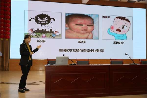 本次講座由菏澤醫(yī)學(xué)??茖W(xué)校護(hù)理系陳玉紅老師擔(dān)任主講,她首先為同學(xué)們介紹了春季常見(jiàn)的傳染性疾病種類:流感、麻疹、腮腺炎等;接著,她結(jié)合春季較為活躍的流行性感冒,從臨床表現(xiàn)、傳播途徑、治療及預(yù)防措施幾個(gè)方面詳細(xì)地進(jìn)行講解,講座深入淺出,貼近生活,通俗易懂。