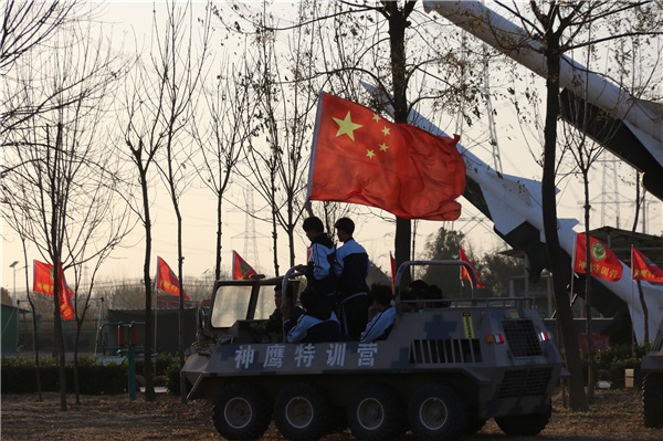“來,孩子們上車!”教官開著一輛車帶著同學們體驗,坐在位置上的同學手里拿著鮮艷的五星紅旗,隨著車子的啟動,紅旗迎風飄揚,成為陽光下最耀眼的一抹紅。