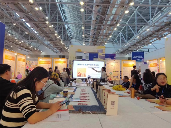 根據(jù)大會日程安排,學(xué)校教師孫國、姜辛雨參與的工作坊項(xiàng)目《盲用凸點(diǎn)彰顯中國漢字文化-漢語表意盲文創(chuàng)建與教育實(shí)施效果研究》在會展中心2號館山東區(qū)進(jìn)行公開展示。在展示活動中,項(xiàng)目團(tuán)隊準(zhǔn)備了精美的宣傳圖冊,播放了和成果相關(guān)的視頻,展示了漢語表意盲文系列圖書。