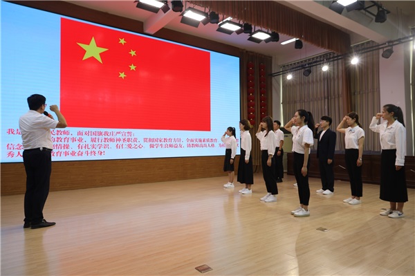 本次大會由黨總支副書記、工會主席張士良同志主持。嘹亮的國歌奏罷,進(jìn)入新入職教師宣誓環(huán)節(jié)。面對鮮艷的五星紅旗,新入職的教師們肅穆而立,高舉右拳,在黨總支委員、副校長王懷寧同志的帶領(lǐng)下,莊嚴(yán)地進(jìn)行宣誓。“忠誠黨的教育事業(yè),履行教師的神圣職責(zé)……”,字字鏗鏘有力,道出為教者的初心。