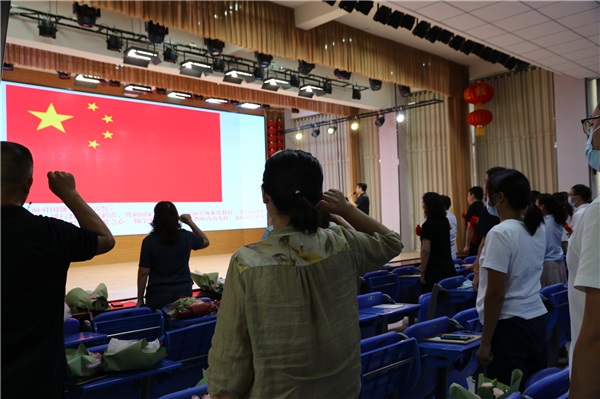 大會開始前,全體教師認真觀看了《習近平的教師情》專題片,深刻感受習近平總書記對廣大教師的關心關懷。本次大會由黨總支副書記、工會主席張士良同志主持。嘹亮的國歌奏罷,全體教師面對鮮艷的五星紅旗,肅穆而立,高舉右拳,在黨總支委員、副校長王懷寧同志的帶領下,莊嚴地進行宣誓。