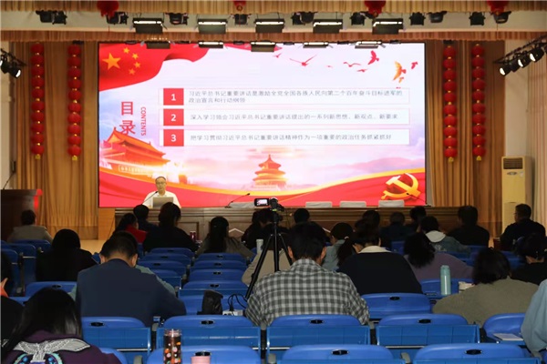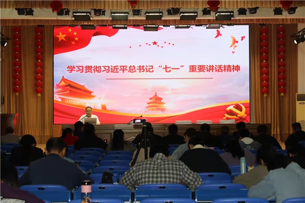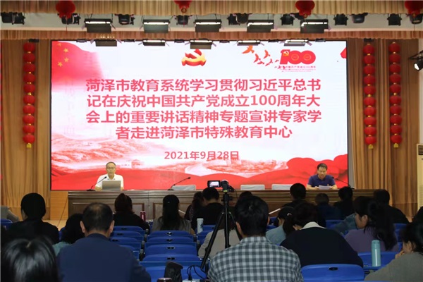 為深入學習貫徹習近平總書記在慶祝中國共產(chǎn)黨成立100周年大會上的重要講話精神,推動黨史學習教育深入開展,根據(jù)菏澤市委教育工委《關于全市教育系統(tǒng)學習貫徹習近平總書記在慶祝中國共產(chǎn)黨成立100周年大會上的重要講話精神專題宣講活動的通知》要求,2021年9月28日下午,菏澤市特殊教育中心邀請菏澤學院教師教育學院黨委副書記、常務副院長、教授陳光磊同志作“學習貫徹習近平總書記‘七一’重要講話精神”專題宣講。活動由黨總支書記、校長毛丕顯同志主持,全體黨員教師共90余人參加。