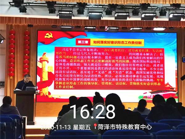 為深入學(xué)習(xí)貫徹習(xí)近平新時代中國特色社會主義思想,全面落實(shí)意識形態(tài)工作責(zé)任制,進(jìn)一步樹牢“四個意識”,強(qiáng)化政治擔(dān)當(dāng)。2020年11月13日下午,菏澤市特殊教育中心黨總支副書記張士良同志在三樓多功能室為全體黨員上了一堂《牢記使命 全面履行新時代意識形態(tài)工作責(zé)任制》的專題黨課。