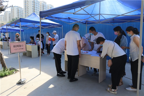 返校當(dāng)天,學(xué)生和家長們早早來到了學(xué)校外等待入校,校外安保人員和負責(zé)引領(lǐng)的老師認(rèn)真地引導(dǎo)車輛有序停放,時刻提醒著大家保持安全的距離排隊進行 入校檢查。在經(jīng)過口罩檢查、體溫測量、消毒等一系列安全檢查后,沒有問題的學(xué)生方可在校內(nèi)引領(lǐng)員的引領(lǐng)下進入校園。為減少人員聚集,家長們送學(xué)生到校門口后選擇從出口離開。由于學(xué)生都為住校生,入校時攜帶著較多的行李,校內(nèi)引領(lǐng)老師們用手推車幫助學(xué)生們進行托運行李。到達宿舍后,再由宿舍管理老師引領(lǐng)學(xué)生進入自己的宿舍,整理自己的內(nèi)務(wù)。隨著入學(xué)進程的發(fā)展,溫度也越來越高,老師們頭頂炎炎夏日,不辭辛苦地一趟又一趟來回于學(xué)校大門和宿舍之間。