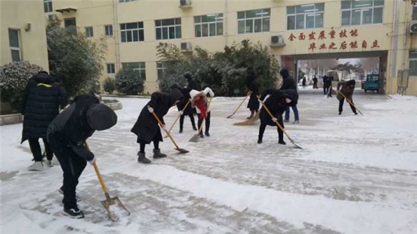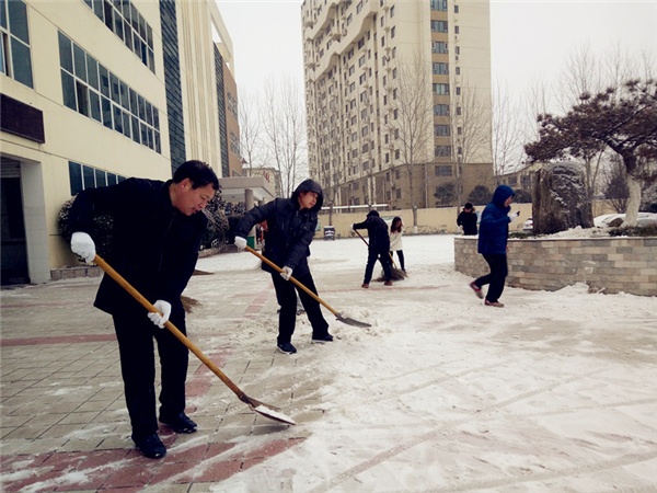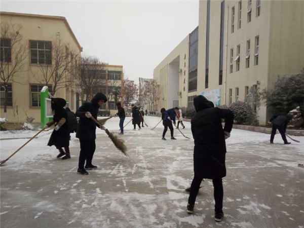 按照清掃積雪方案,教師們分工合作,有的拿鐵鍬、有的拿掃帚,積極主動(dòng)的投入到掃雪的活動(dòng)中。在大家的努力下,經(jīng)過近一個(gè)小時(shí)的勞動(dòng),教學(xué)樓前的道路及通往宿舍和餐廳路段的積雪全部清除干凈,為我校師生的出行提供了可靠保證,也為過往車輛和行人創(chuàng)造了一個(gè)安全的出行環(huán)境。