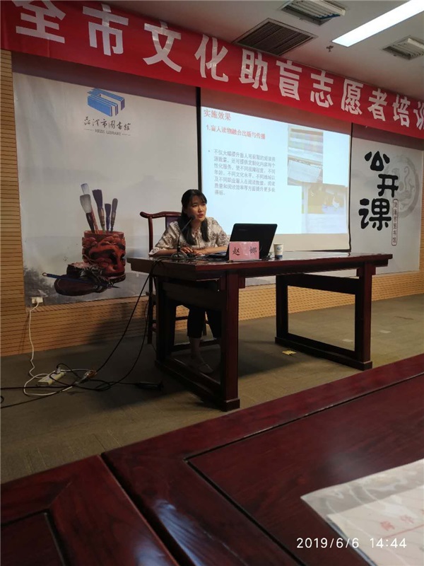 為踐行社會主義核心價值觀,推動文化助盲志愿服務常態(tài)化、專業(yè)化和有效化發(fā)展,菏澤市圖書館特邀請我校石秋芝、趙娜兩名教師來館進行文化助盲志愿服務培訓活動。