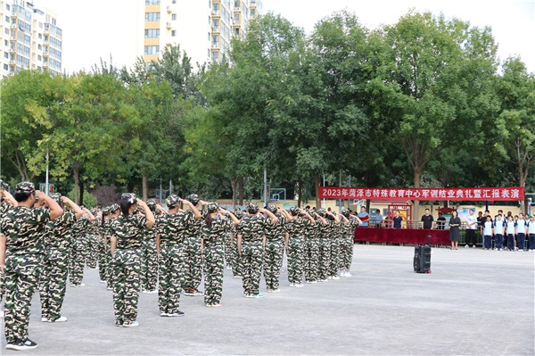 為培養(yǎng)學(xué)生良好的生活習(xí)慣,磨練不怕苦不怕累的意志,增強(qiáng)學(xué)生們的身體素質(zhì)和國(guó)防觀念、紀(jì)律觀念,同時(shí)展現(xiàn)軍訓(xùn)成果,9月15日,菏澤市特殊教育中心為期一周的軍訓(xùn)迎來了結(jié)業(yè)典禮暨匯報(bào)表演。參加本次軍訓(xùn)的為學(xué)校視障部及聽障部初中及中職階段學(xué)生,共計(jì)14個(gè)班級(jí)。