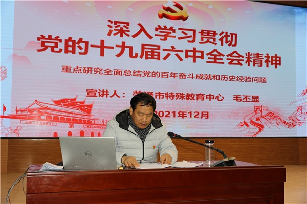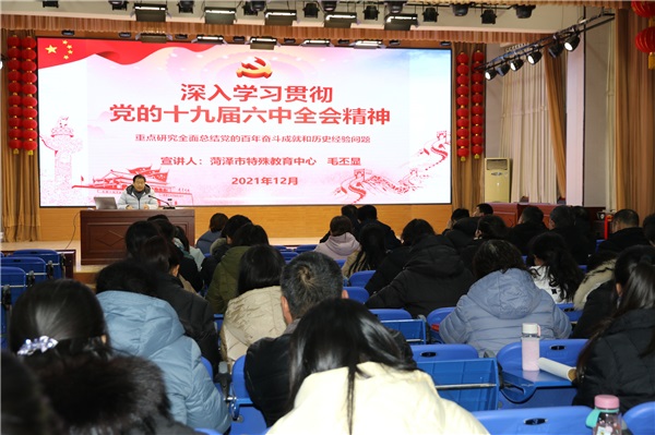為深入學習貫徹黨的十九屆六中全會精神,進一步推動黨史學習教育走深走實,根據(jù)市委教育工委安排,2021年12月24日下午,菏澤市特殊教育中心黨總支開展學習貫徹黨的十九屆六中全會精神宣講活動,學校黨總支書記、校長毛丕顯同志作宣講報告,學校50余名黨員參加了本次宣講活動。